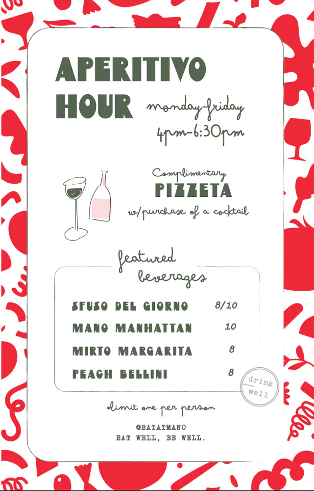 Join us for Aperitivo Hour Monday through Friday 4pm - 6:30pm with $8 & $10 cocktails and enjoy a complimentary pizzeta with your cocktail purchase.
